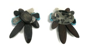 Auguaonyx Brooch (splitframe) |broken skateboards. cement. mild steel. leather. wenge wood. sterling silver. pigment.